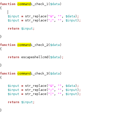 commandi_check_1은 "&",";"를 ""로 대체하기 때문이고 commandi_check_2 함수는 escapeshellcmd 함수가 적용되어 있기때문이다.