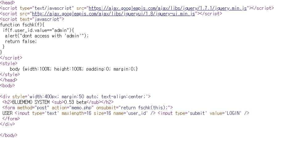 코드를 살펴보면 "admin"이라고 입력한경우 "admin은 접근이 안된다"라는 경고창이 뜬다.