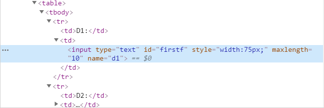 <tr><td>D1:</td><td><input type='text' id="firstf" style="width:75px;" maxlength="9" name='d1'></td></tr>