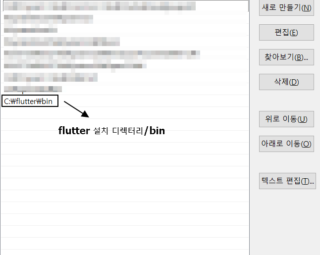 고급 시스템 설정 보기 -> 환경 변수 -> 시스템 변수 -> "PATH에 Flutter SDK 설치파일 / bin" 폴더 설정