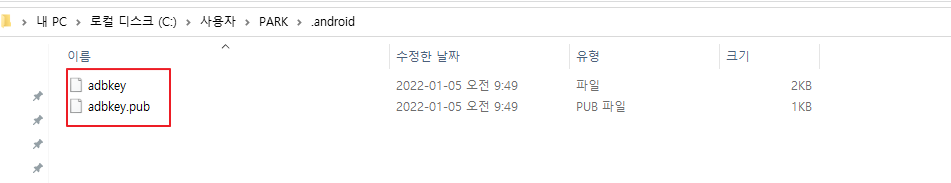 3. c드라이브 -> user -> 이름 -> .android 서 adbkey 관련 파일 삭제
