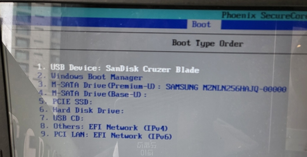 BIOS 설정에서 BOOT -> Boot Type Order 들어간 후