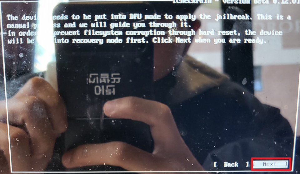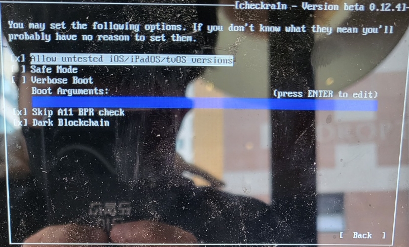 A11 기종 이상의 경우 다음과 같이 체크를 해주고 A11 기종 이하의 경우는 Dark Blockchain만 체크를 한후 Back을 누른 후 아이폰과 컴퓨터와 연결을 해준다(중요)