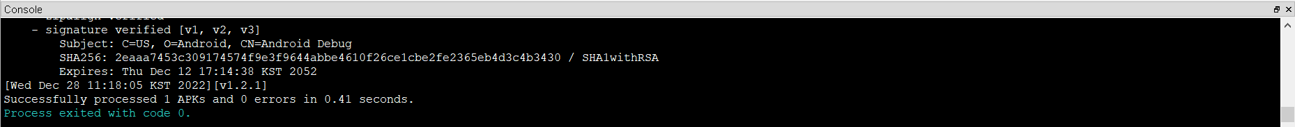 "Process exited with code 0"이라는 메시지가 뜨면 정상적으로 sign 된거다.