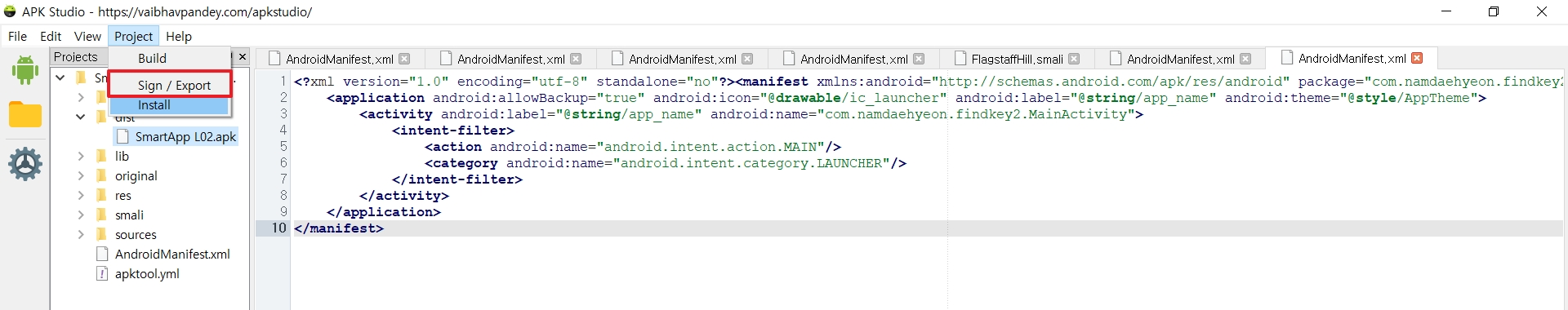 dist 디렉터리에 apk 파일이 생성되는데 이 앱을 클릭하고 Project 메뉴를 클릭하면 sign/export가 활성화 되어 있는 것을 확인 할 수 있고