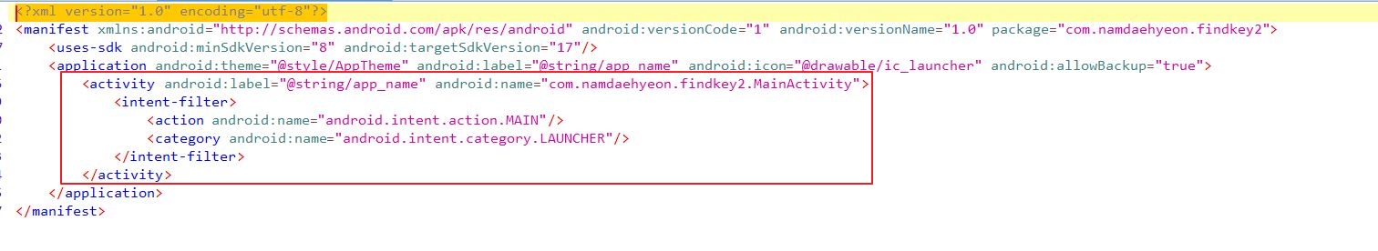 App이 실행될 때 "com.namdaeheyon.findkey2.MainActivity"가 가장 먼저 실행되는 것을 알 수 있다.