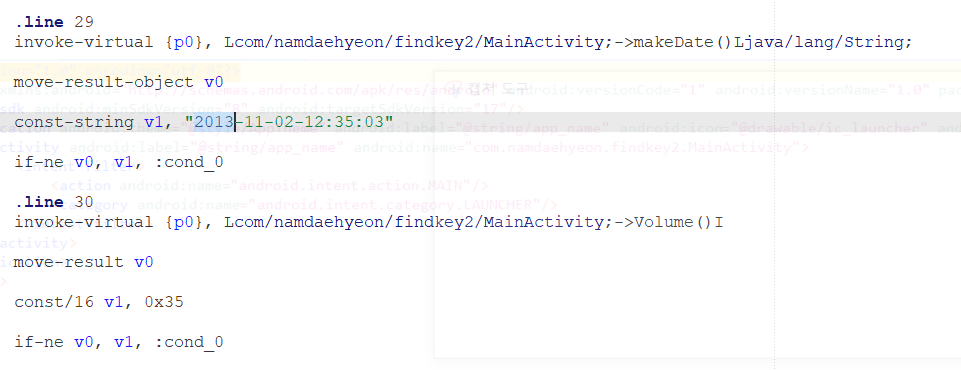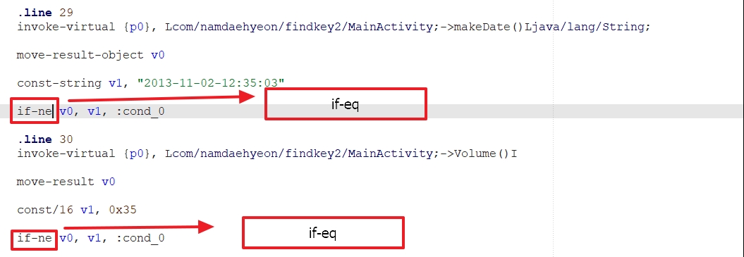 그러므로 .line 29와 .line30의 값이 일치하는 경우 cond_0으로 보내면 된다.