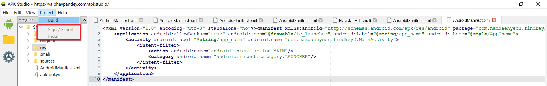 그 후 "Build" -> "Sign/Export" -> "install"을 해주게 되면 새로운 FindKey2(이전에 설치했던 apk는 삭제해야함)가 설치되고