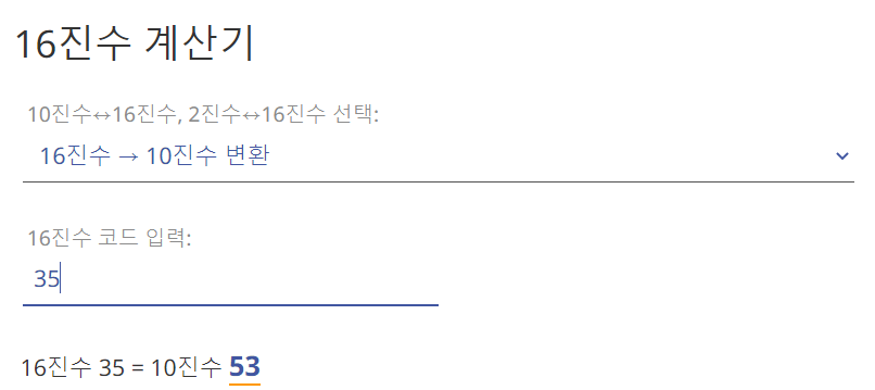 16진수 0x35를 10진수로 바꾸면 53이다.