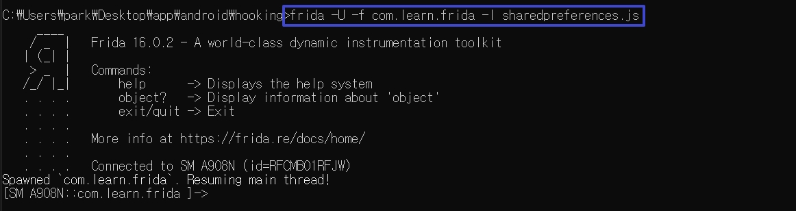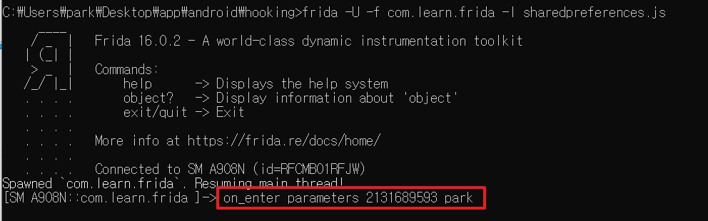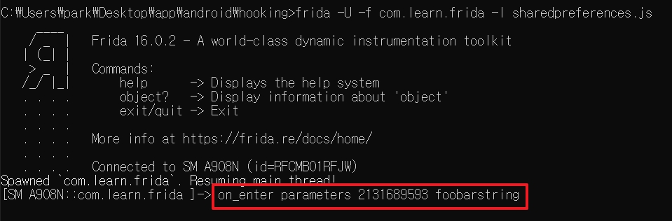 동작 코드 = frida -U -f [패키지명] -l [작성코드]