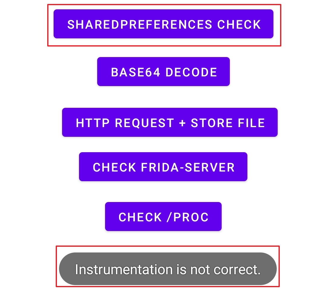 SHAREDPREFERENCES CHECK 클릭 시 "Instrumentation is not coorect" Toast 메시지 출력하는 것 확인하였다.