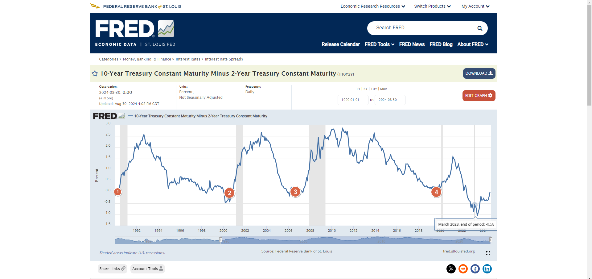 - FRED에서 제공하는 10-Year Treasury Constant Maturity Minus 2-Year Treasury Constant Maturity에서 1990년부터 현재까지의 장단기 금리차를 비교하는 표이며 좀 더 상세히 설명하면
