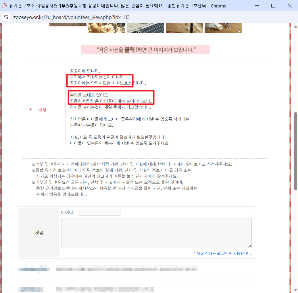 유기동물 보호센터 중 어느 곳이 괜찮을까 검색 중에 "꽁꽁이네" 유기견 보호센터를 발견하였다. 나의 마음을 움직인 이유는 다음과 같다