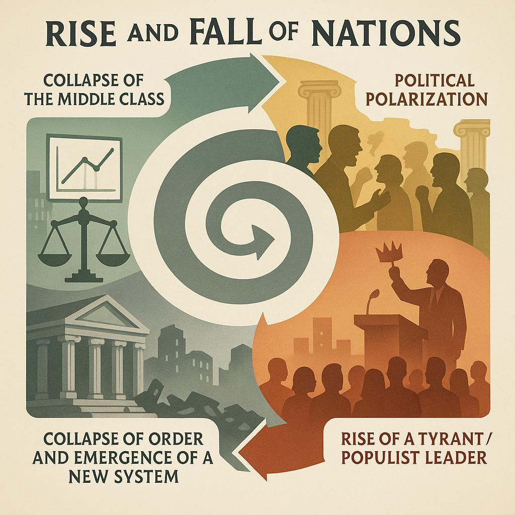 그래서 오늘은 이 두 사상가의 핵심이론을 연결하여 국가 쇠퇴의 패턴을 단계적으로 정리해보려고 한다.